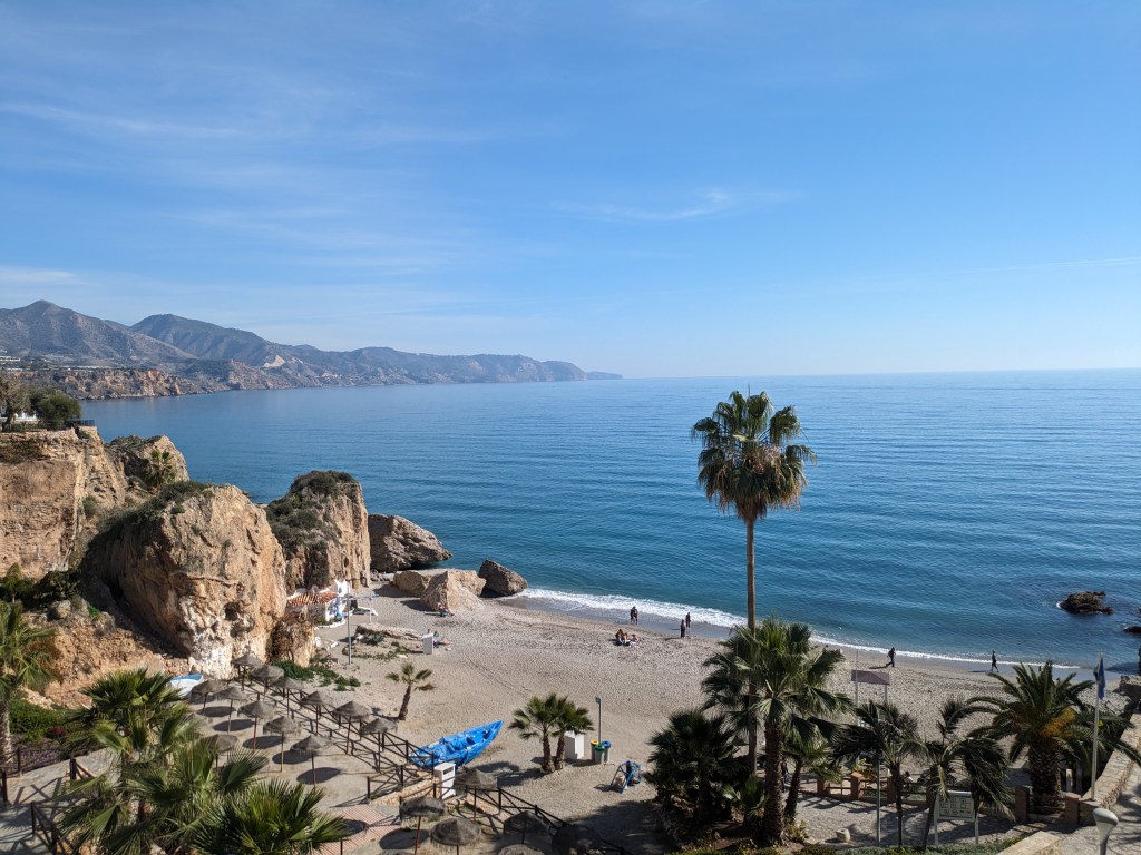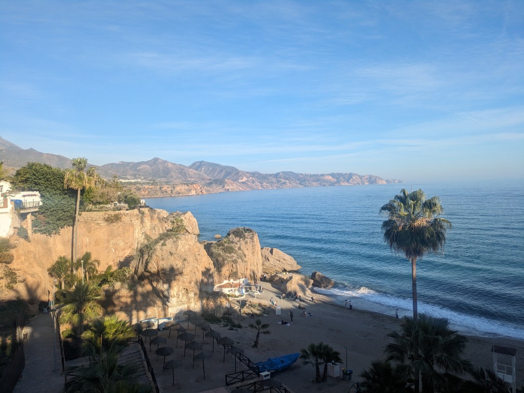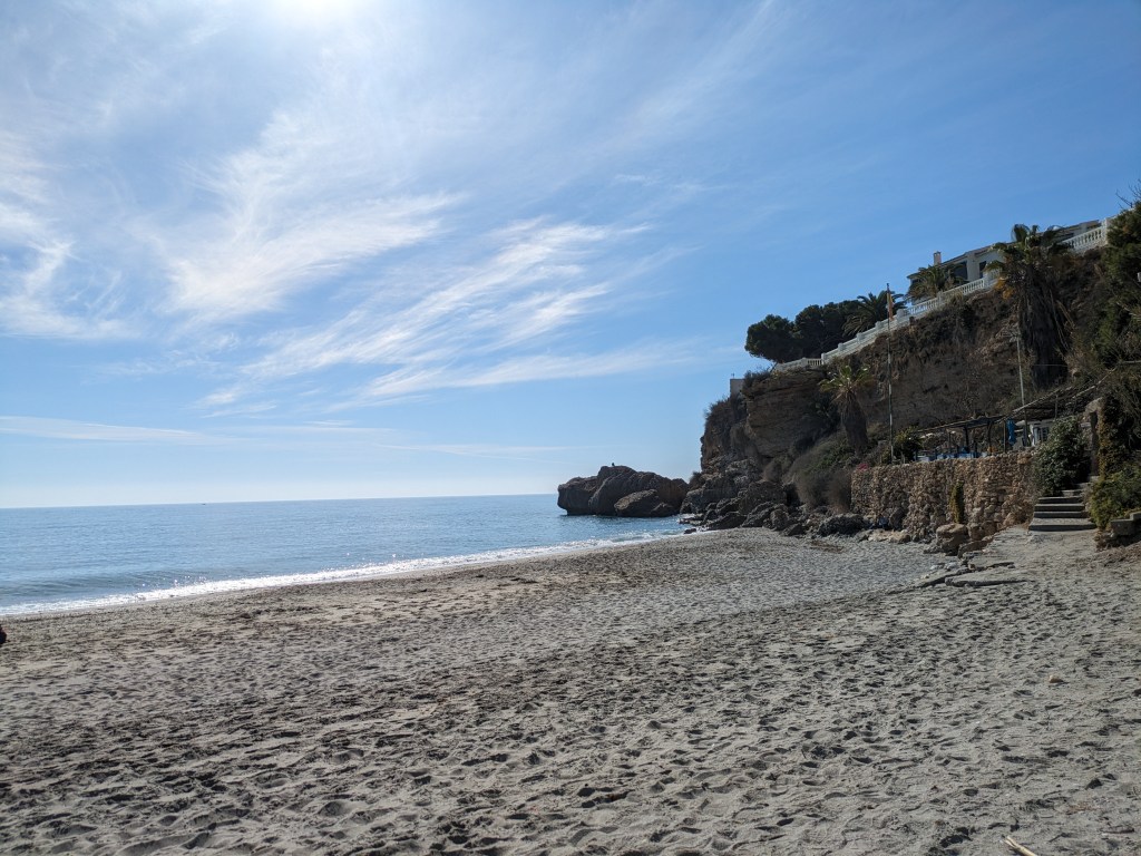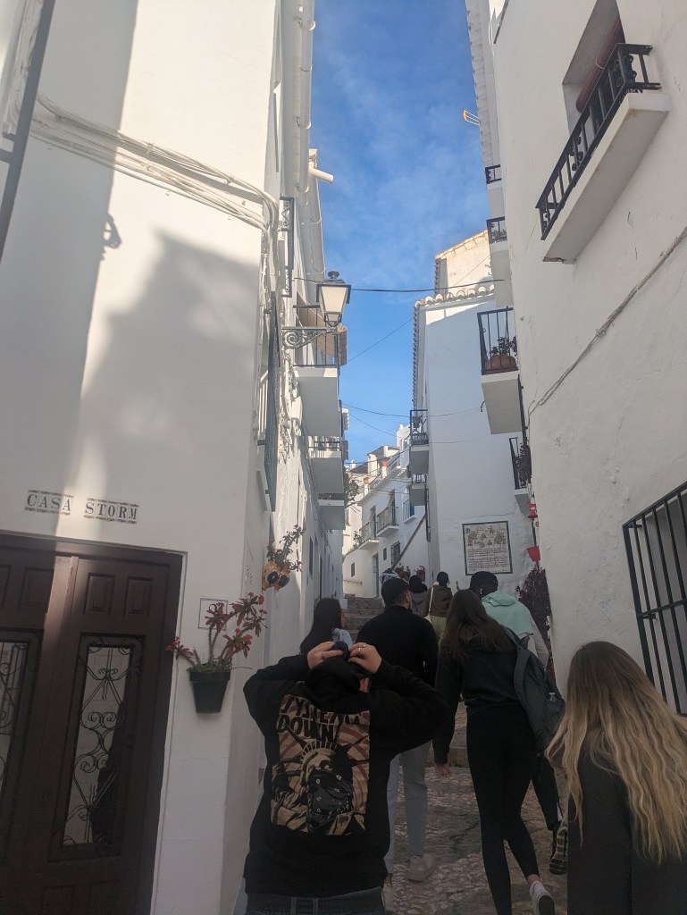We went to Frigiliana & Nerja today and it was such a wonderful and beautiful experience. Everything was perfect and beautiful and it wasn’t too touristy or overwhelming. We got to see the beautiful village of Frigiliana and while everyone else in the group went off to get lunch I wanted to go hike to the top of the village and get a wonderful view down below. I saw loads of critters and the views were stunning and it wasn’t that difficult of a hike either. After Frigiliana we got to see the caves of Nerja which were beautiful too, but super hard to see or even take photos of because of how dark it is inside. After that we got to go to nerja itself and I went and had myself lunch which was delicious and then got myself a towel to go and enjoy the lovely and relatively quiet beach in the absolutely perfect weather that we got blessed with today.