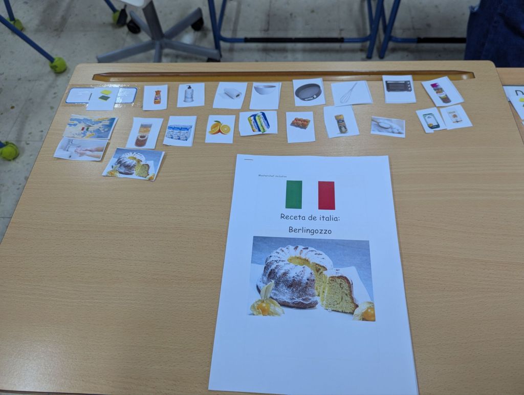 I have also noted that the videos that are being played also use hand signals as some of the children in the class are non verbal. So I’ve been trying to learn some of the hand signals. It is a great way to learn sign language. As the kids were watching TV, another teacher was setting up a row of tables in the kitchen area with table cloths and plastic table covers. Mid, we were joined by the junior infants class and after they all sat down and settled, an A4 booklet with spaces on it to glue pictures in was placed on every table with cut outs of baking products, numbers and aftercare after baking were paid on each table. Bit by bit the kids were guided on where to glue the images for the recipe of a ‘Berlingozzo’ cake. Then Steps one through to ten and the steps to take after to clean up which includes washing their hands. It was great fun and the kids appeared to really enjoy themselves. After the recipe booklet was finished, everything from the exercise was cleared away and all the children were guided towards the table to help another teacher measure and mix all the ingredients for the cake.