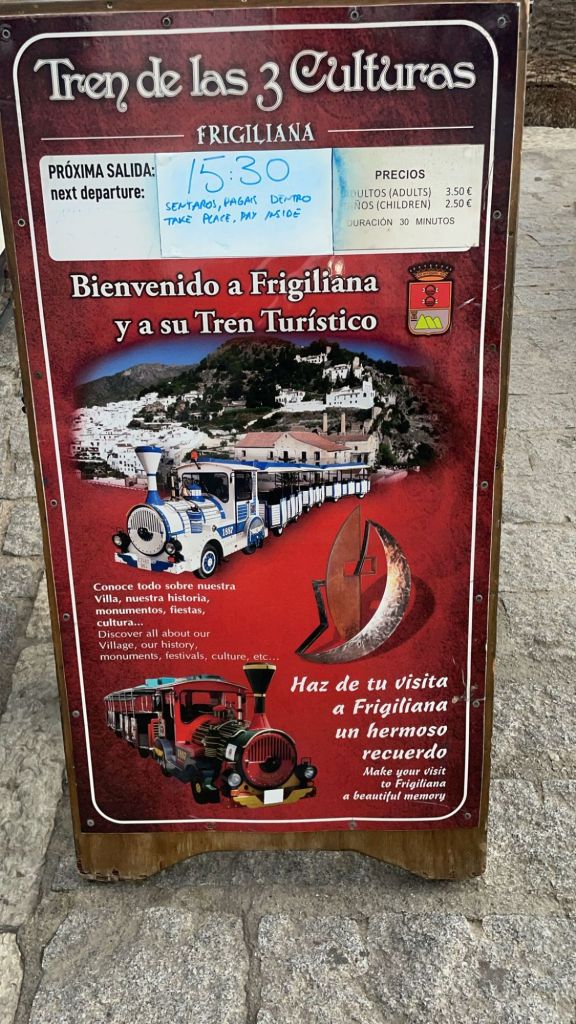 After Nerja we then stopped off in a village called Frigiliana. It’s a lovely village which is perched high in the Almijara mountain range, overlooking the crystal clear Mediterranean Sea and it is well worth a visit. It has steep narrow cobbled its white washed buildings and we had a little time to look around. There was a tour train, so a bunch of us took the train tour as it’s the best way to see the village. It only cost €3.50 for the 25 minute or so trip and a nice experience. The driver stopped off at a stopping point and gave us some history of the village. History is a wonderful thing and we were lucky to have had such great weather for the duration.