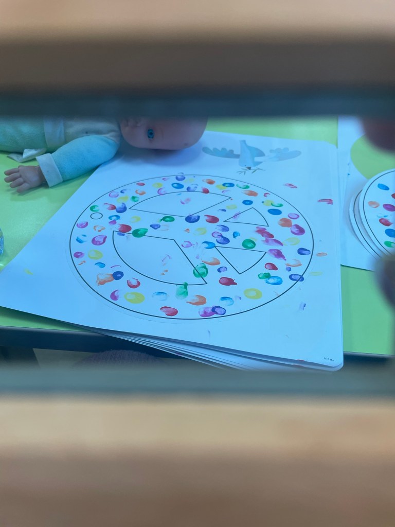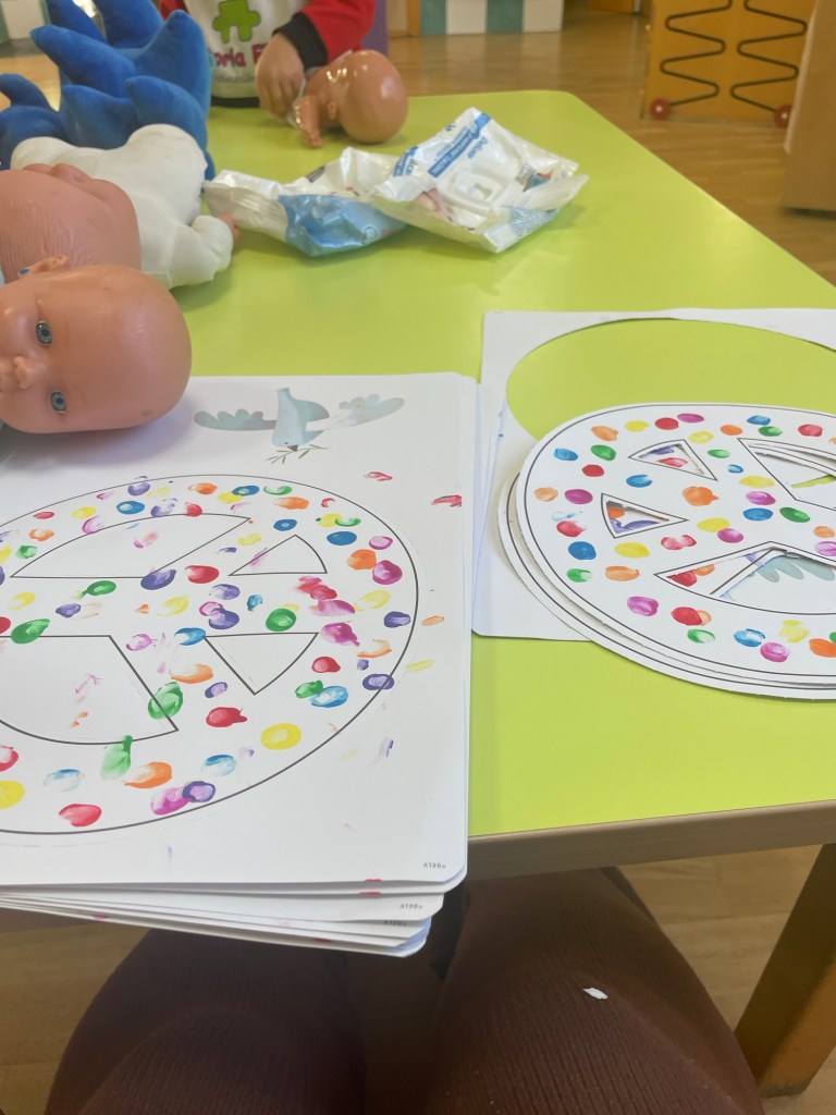 Tomorrow (30th) the school day of non-violence and peace is celebrated all across schools in Spain. Yesterday (28th) I helped the children do some finger painting as they were decorating peace signs then I put them up to dry. Today I cut them out and tied string to them for the children to wear as necklaces.